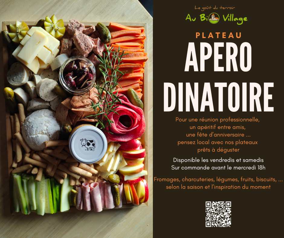 Plateau apéro saisonnier composé de fromages, charcuteries, légumes, fruits, tartinable végétal, ...